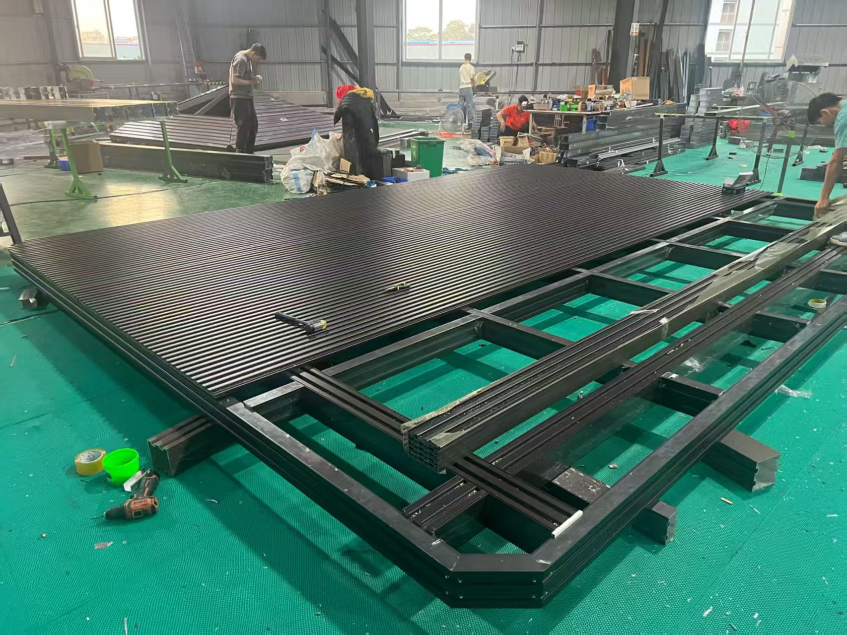 কর্মশালার মেঝেতে, পেরগোলা ফ্রেমগুলি প্রথমে বিভাগে একত্রিত হয়। সারিবদ্ধকরণকে নিয়ন্ত্রণ করা সহজ করতে আমরা কাঠামোটিকে সমতল করি। এটি নিশ্চিত করতে সাহায্য করে যে প্রতিটি সংযোগ বিন্দু সঠিকভাবে ফিট করে এবং সামগ্রিক মাত্রা সঠিক থাকে।